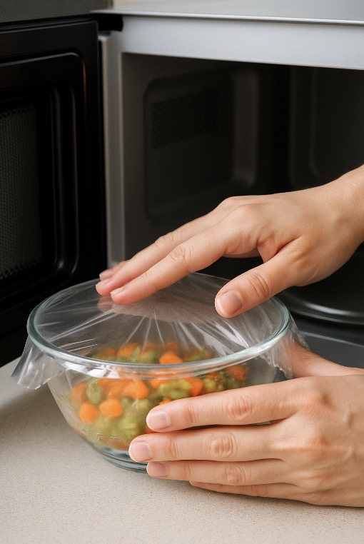 전자레인지 전용 랩만 사용하고, 랩이 음식에 직접 닿지 않도록 그릇 가장자리에 느슨히 씌웠습니다. 고온 스팀이 닿는 면적을 줄이면 가소제 전이가 줄었습니다.